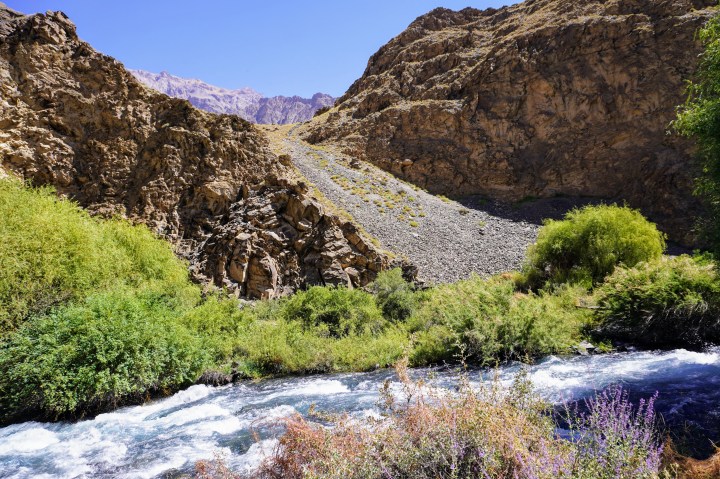Trois villages ou plutôt trois minuscules hameaux se recroquevillent au fond de la vallée. Les maisons traditionnelles en pierre aux toits plats sont espacées par des lacs turquoises aux eaux assoupies. Autour ce sont des falaises de tungstène ou bien des déluges de rocailles qui dégringolent jusqu’à l’eau mentholée.