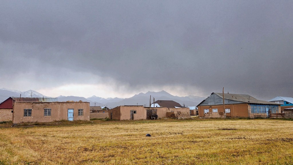 A Sary-Tash, nous croisons la Pamir Highway empruntée un mois plus tôt du côté tadjik. La boucle se dessinait dans nos têtes d’apprentis géographes. 19h00, Sary-Mogul, un village qui ressemble un peu à Bulunkul dans le Pamir, en plus grand. Il n’y a rien et c’est haut. Cette fois l’accueil se fait sous la pluie.