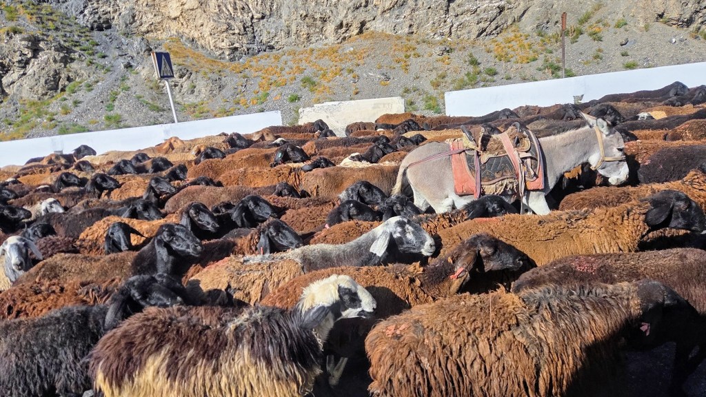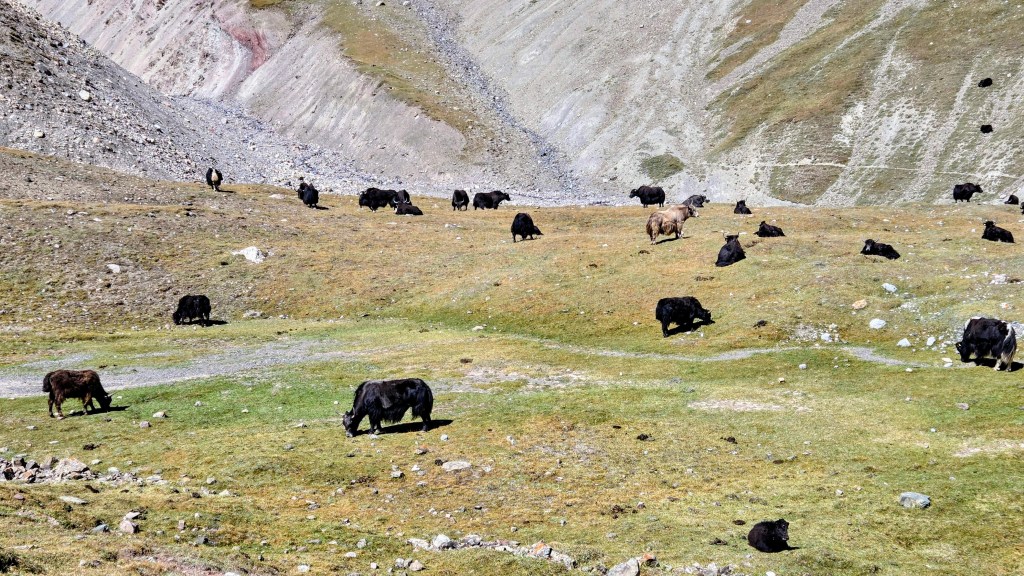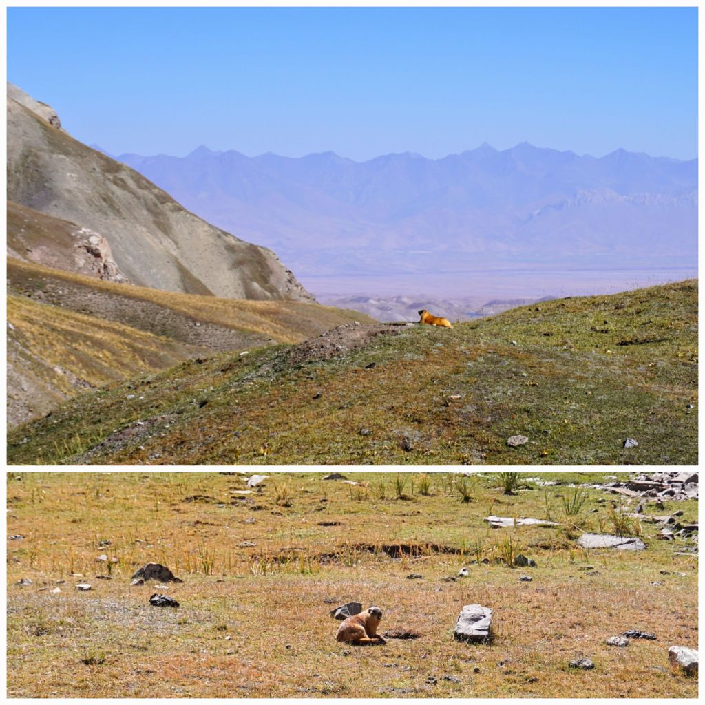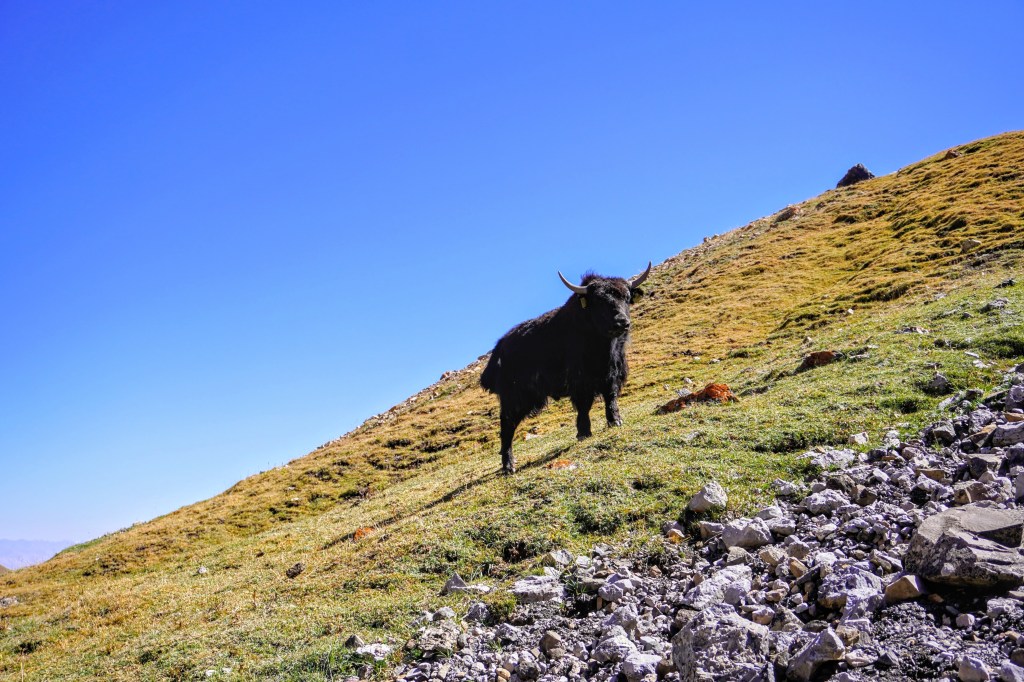Le lendemain, on suit les marmottes. Debouts ou allongées sur une pierre au soleil, elles ponctuent notre ascension vers le col des voyageurs. Elles ralentissent évidemment la progression tant c’est un plaisir de prendre la pause en même temps qu’elles pour les observer à loisir. Plus haut un troupeau de yacks étiré sur un versant semi-aride devient l’ultime gardien de la passe. On l’atteint en fin de matinée.