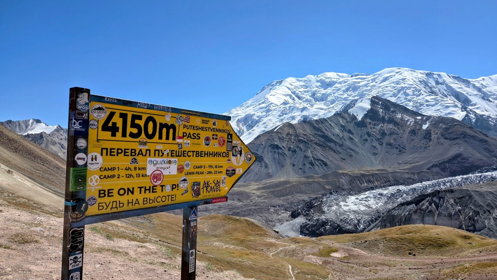Cette montagne, si elle est renommée pour être relativement accessible détient un nombre plutôt élevé de pertes, des plaques commémoratives en témoignent lorsque nous progressons sur le sentier. Escaladé pour la première fois en 1928, le pic est alors considéré comme le plus haut sommet du Pamir. Il est détroné en 1933 par un autre, un peu plus élevé, à qui l’Union Soviétique décernera naturellement le nom de pic Staline. Admirer les cimes donne parfois des leçons d’histoire et d’égocentrisme. En 1934, c’est un des plus illustres alpinistes soviétiques, Vitali Abalakov, qui y montera un buste de Lénine. Le pic connaît ensuite de belles victoires comme en 1974, où une cordée exclusivement féminine de huit russes fait la course au sommet. Une d’entre elles le paiera de sa vie. En 1990, c’est un autre drame absolu qui marquera toute l’histoire de l’alpinisme. C’est un tremblement de terre qui ensevelira le camp de base II et qui emportera 43 alpinistes en quelques instants.