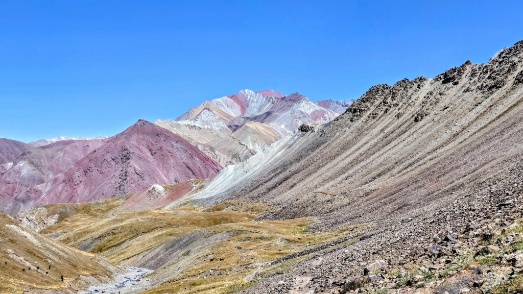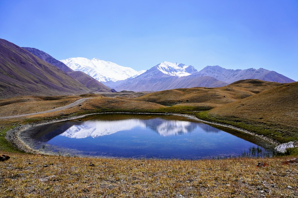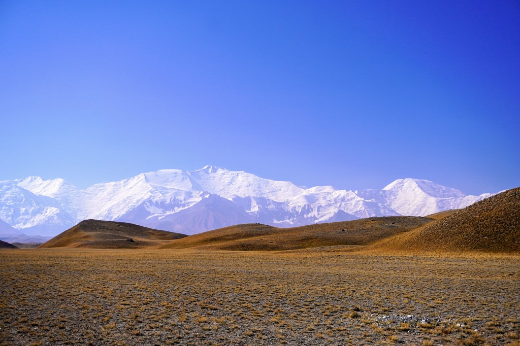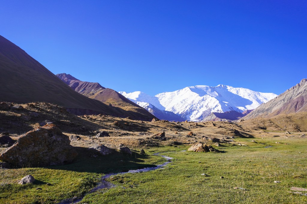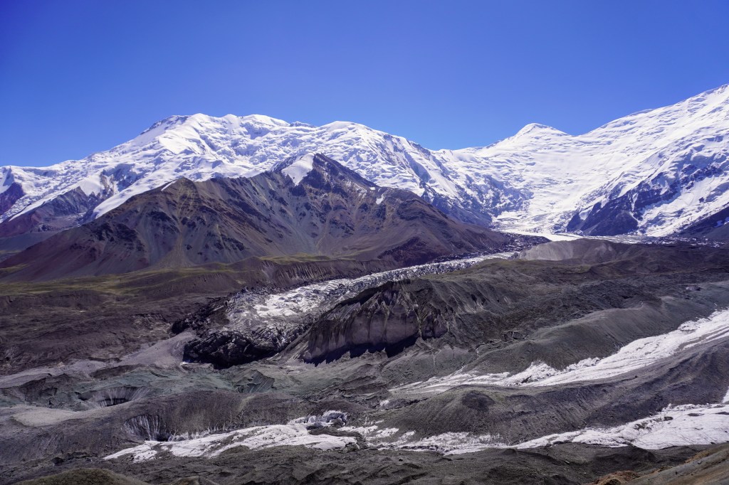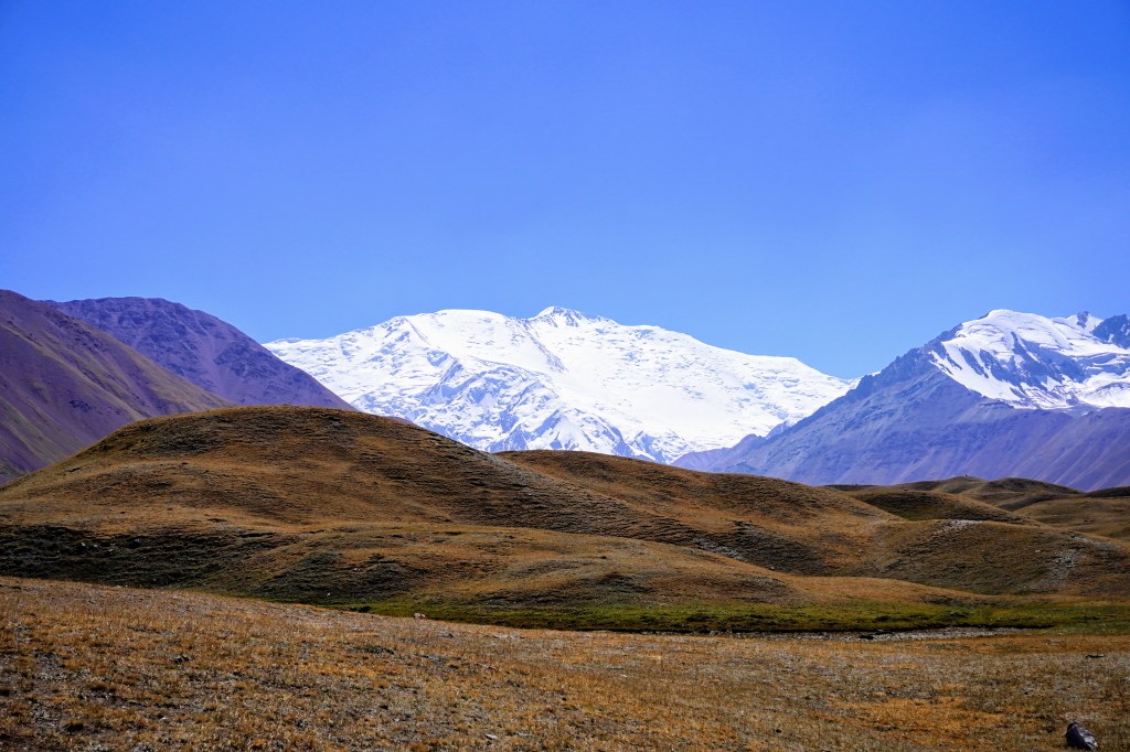 Depuis les 4150 mètres d’altitude du col, c’est le pic Lénine enneigé et un glacier gris velouté à ses pieds qui décrit un paysage de haute montagne. Il est, un peu plus bas, entouré d’autres reliefs exceptionnellement colorés d’où les pentes oxydées évoquent une explosion orchestrée par un peintre artificier. La nature est une artiste qui ne finira jamais de nous éblouir.