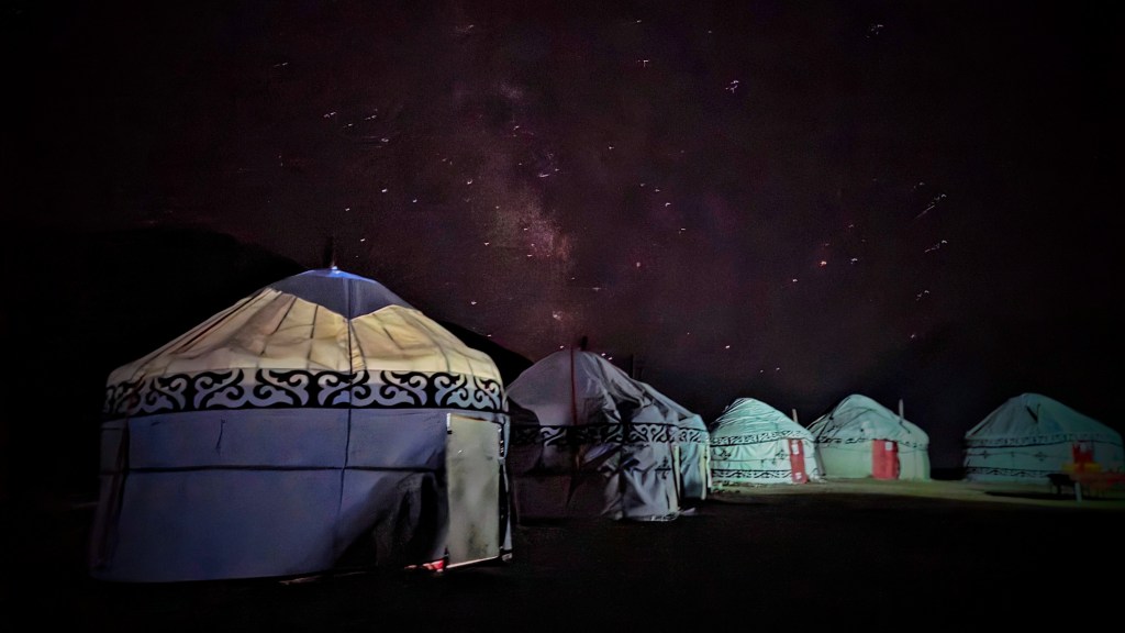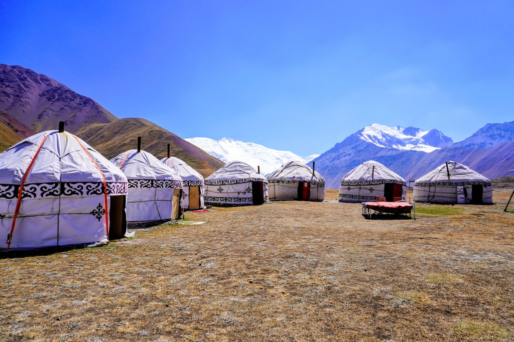 Milieu d’après-midi, la steppe disparaît au profit du relief de montagne. Un chemin escarpé, quelques éleveurs ont commencé à plier yourtes et bagages pour redescendre avant le temps mauvais. La neige est précoce dans les environs. On trouvera une yourte encore debout pour nous héberger les deux prochaines nuits. Un petit poêle au centre où on brûlera des bouses séchées ce soir pour parer aux morsures du froid, une natte sur une planche de bois pour le couchage, des tapis pour isoler du sol. Et puis rien d’autre. Juste un ciel étoilé d’anthologie et l’ombre du pic Lénine pour couvrir notre sommeil.