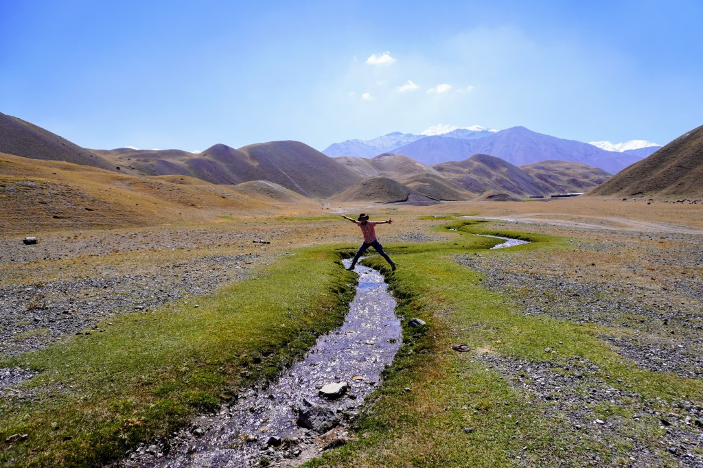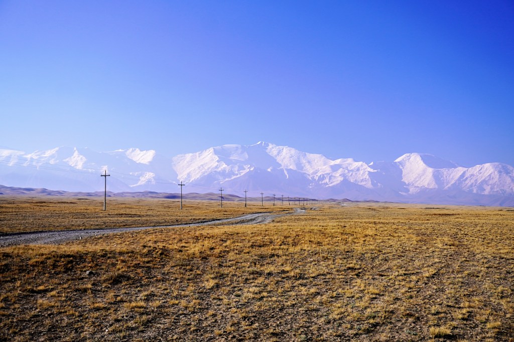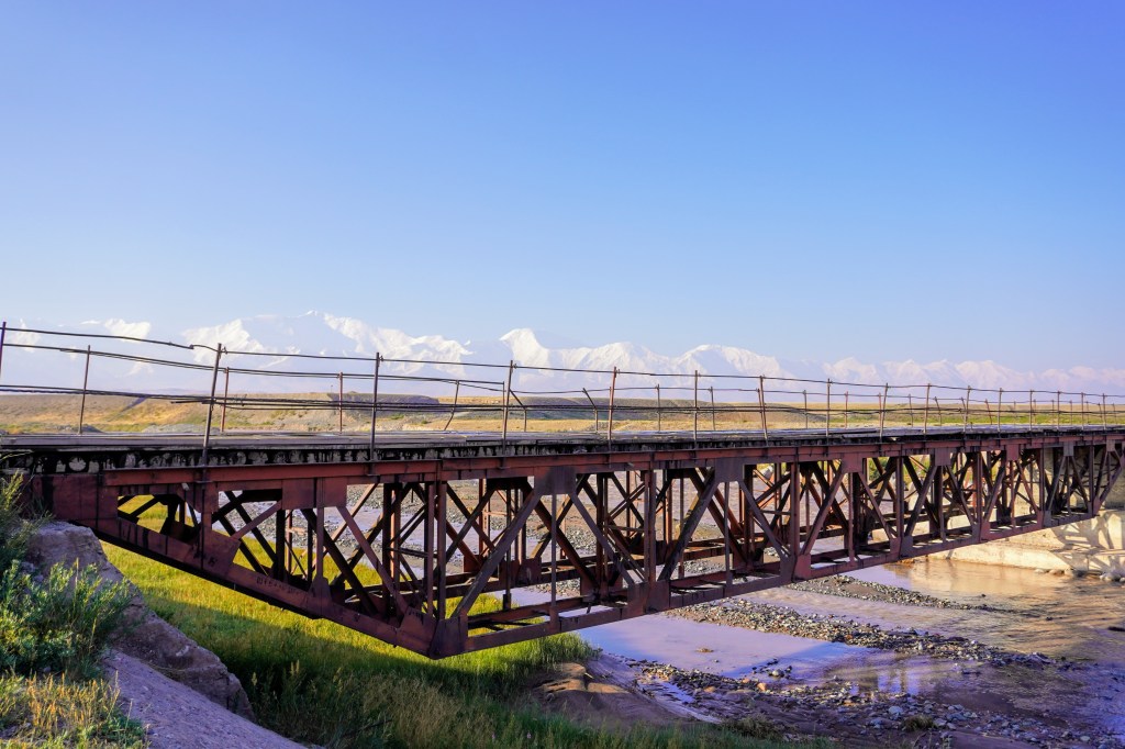On nous avait prévenu de ne pas aller à Tulparkul à pied car la route était monotone et il y avait de la poussière. On part quand même un matin à 7h00. C’est vrai qu’il y a de la poussière. Le soleil donne déjà sur le pic Lénine. On traverse le pont de la rivière Sary-Mogul, la steppe est devant nous jusqu’à aller buter contre les montagnes enneigées. C’est sublime, on ne regrette rien.