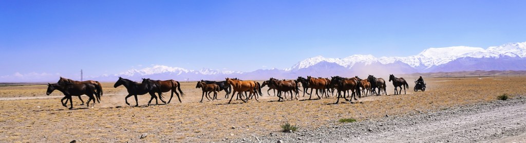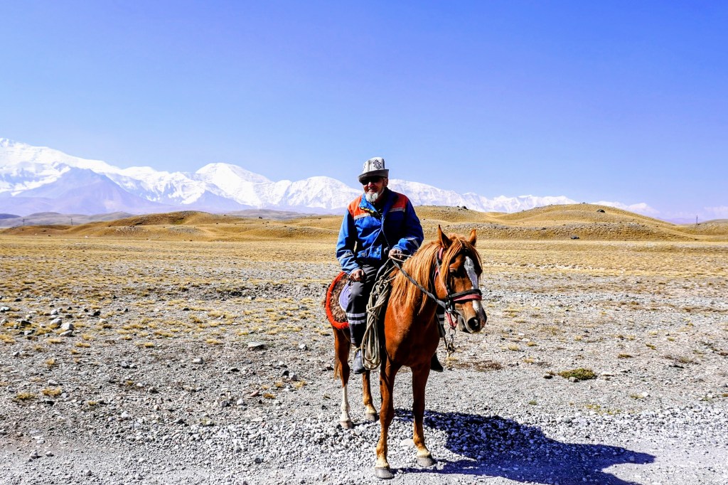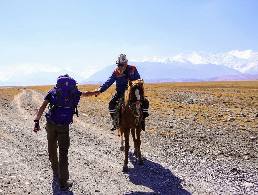 Nous croisons plus tard un cavalier kirghize qui mène son troupeau dans la vallée. Échange de prénoms, d’âges et de géographies. Et puis nous regardons tous les trois loin autour de nous. « Droit devant, le pic Lénina ! » dit-il en pointant du doigt le sommet le plus élevé de la chaîne des montagnes Alay. Conversation minimaliste, échange essentiel. « Qui, quoi, où ». Suffisant dans la steppe pour bien s’entendre avec les rares personnes que l’on croise.
