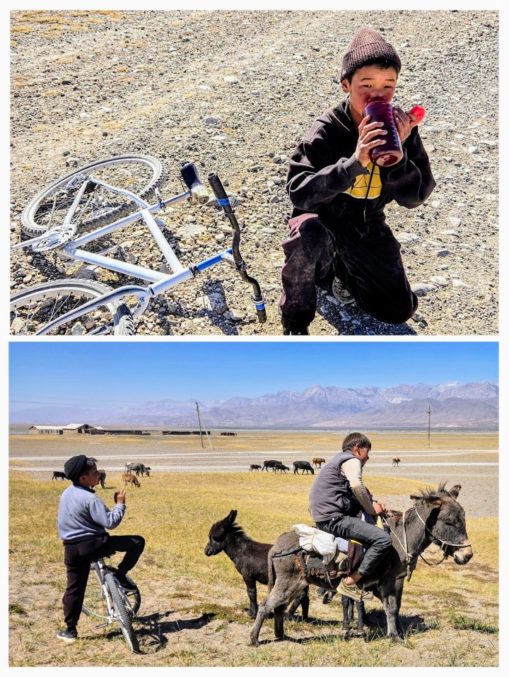 Nous referons le chemin inverse le lendemain pour rejoindre Sary-Mogul dans la vallée à 3000 mètres. Les mêmes trente kilomètres de caillasse et de méditation aérienne qu’à l’aller. Nous marchons cette fois en compagnie d’espiègles gamins qui ont pour tâche de redescendre les troupeaux à la fin de la saison des estives. On partage avec eux l’eau de notre gourde et le « qui, quoi, où » du désert. Ils sont les sourires radieux des steppes, les enjoués Tom Sawyer et Huckleberry Finn de la transhumance poussiéreuse, les derniers des mohicans kirghizes. On est avec eux sur la terre rase, de toutes les guerres des boutons.