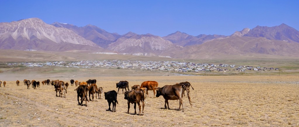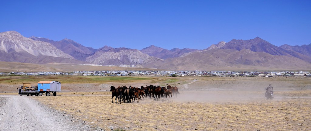 Pour rejoindre Sary-Mogul, il faut compter quatre ou cinq heures de marshrutka, une confortable route d’asphalte. Il faut s’enfoncer dans une vallée qui monte progressivement jusqu’à presque 3000 mètres. Les monts aux courbes douces prennent en ce moment la couleur des blés. Ce qui pouvait être fauché finit de sécher, le reste revient aux animaux et à la montagne. C’est la fin de l’été. Les maisons alternent avec les yourtes au hasard d’un renfoncement entre deux collines ou profitent d’un relief un peu plus plat qu’ailleurs. Mais ce sont les animaux qui tiennent le haut du pavé. Les troupeaux sont partout, libres de paître et vaquer où ils le veulent. Une vache passe la route sans prévenir, les chèvres se réservent les versants les plus escarpés tandis que les chevaux, par dizaine, colonisent la steppe sans limite. L’homme devient insignifiant et retrouve sa place.