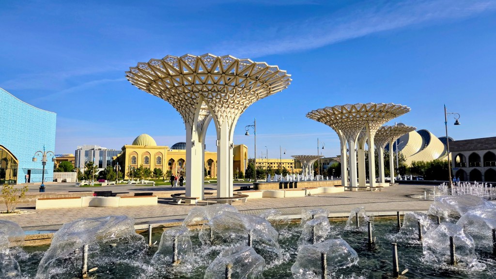 Et si l’architecture nous enthousiasme souvent, il reste malgré tout ce sentiment ambivalent de nous promener dans un musée. Excepté le ballet des véhicules qui ne cesse que rarement, la vie a déserté le bitûme ou bien ne l’habite pas encore. Les grandes avenues, aux larges trottoirs sont presque déserts et on se sent rapidement contraints de contempler seuls ces œuvres d’art en plein air. Ce constat ne concerne évidemment pas qu’Astana car nous avons déjà éprouvé cette impression en flânant dans d’autres villes modernes. A chaque fois, la vie aime se réfugier derrière ses anciens murs trop penchés, dans ses anciennes ruelles un peu tordues tandis que la ville plus confortable et clinquante ne laisse que rarement entendre le battement d’un coeur. Peut-être faut-il patienter un peu avant que les humains acceptent de vivre dans le futur.