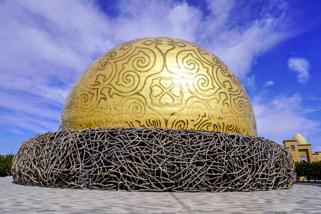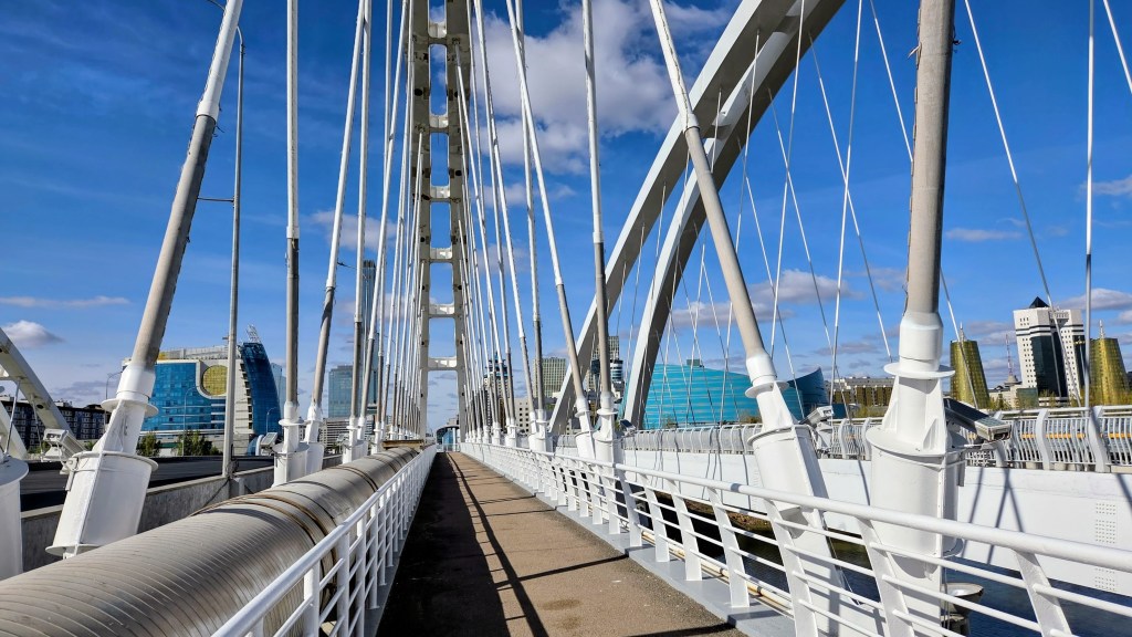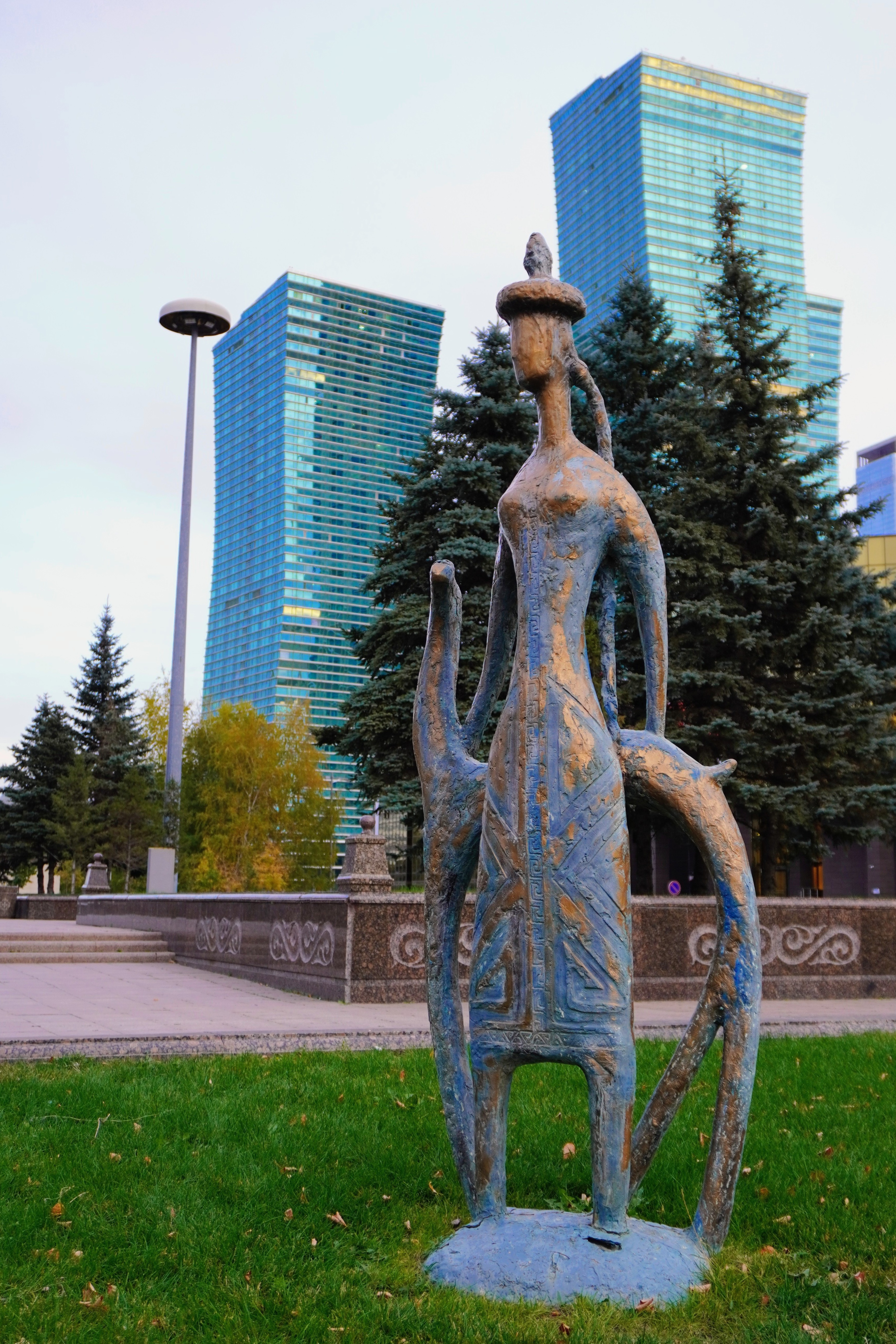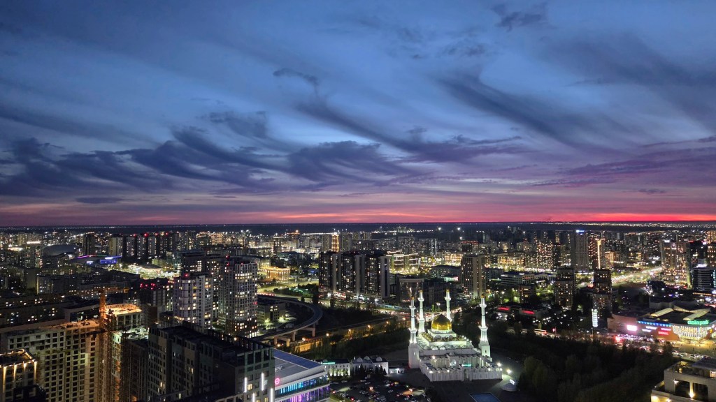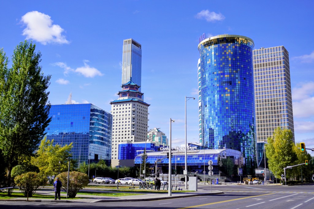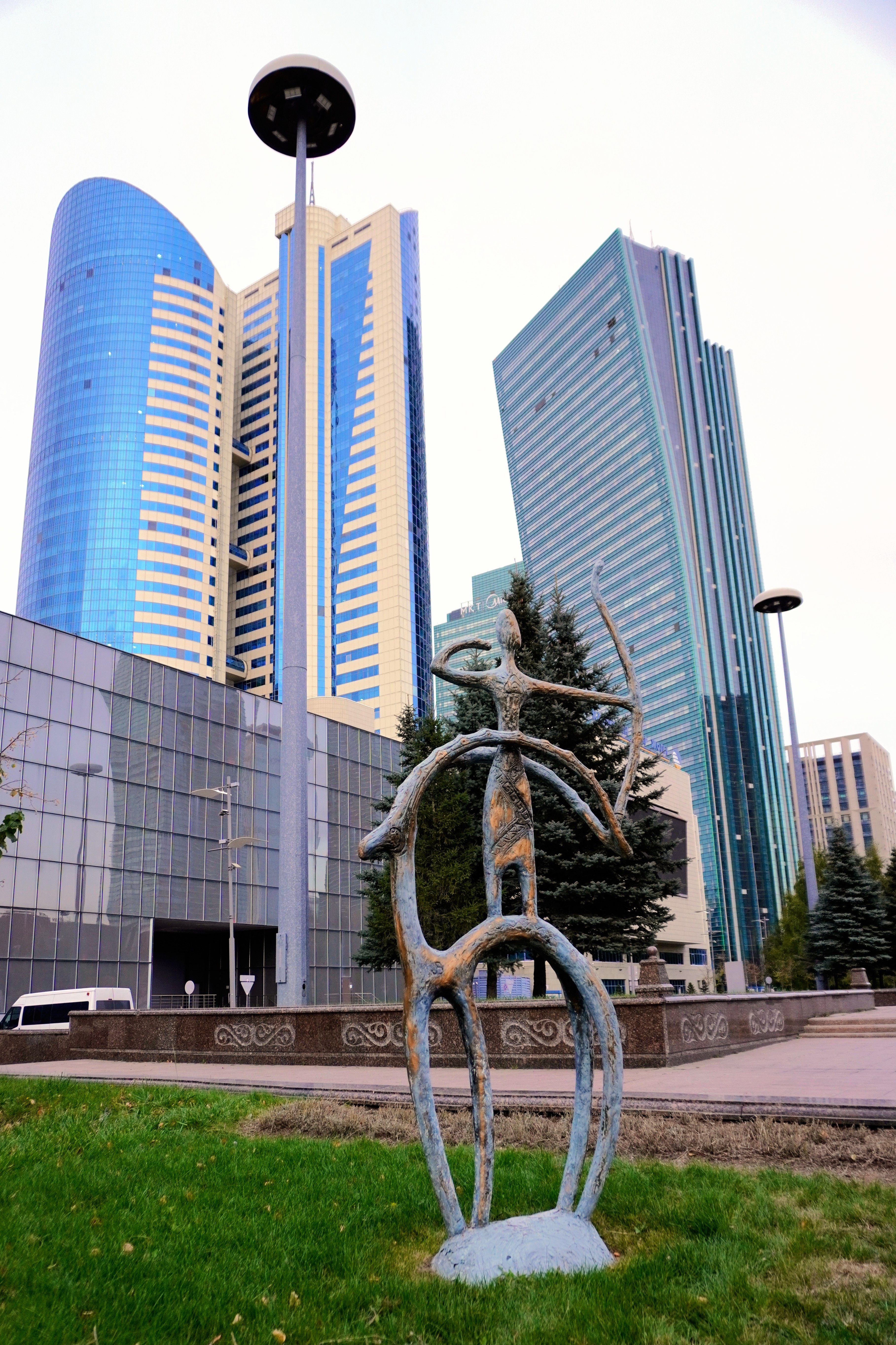 Vingt années sont passées, Nazarbaïev a cédé le pouvoir tandis que la steppe est ici désormais verticale. Ces villes champignons ont une esthétique éminemment discutable mais nous devons reconnaître que les multiples perspectives que l’on découvre au gré de nos divagations piétonnes donnent l’impression de nous promener au milieu d’un concours d’architectes. On passe notre temps à détailler chaque immeuble qui se veut plus original que le voisin. Lorsqu’on est sur le trottoir, on vit la tête en l’air et dès que l’on rejoint notre nid d’aigle, on colle le nez à la vitre pour regarder plus bas.