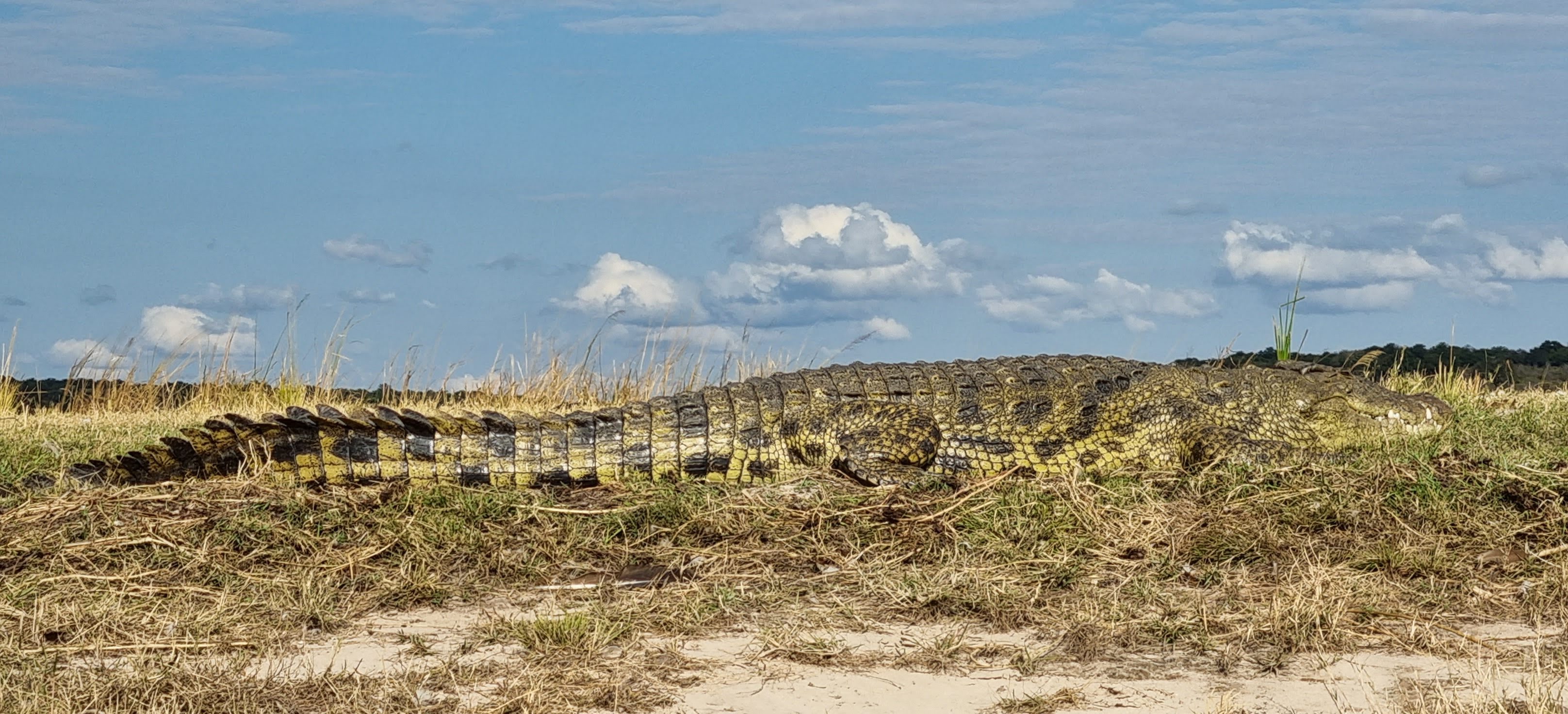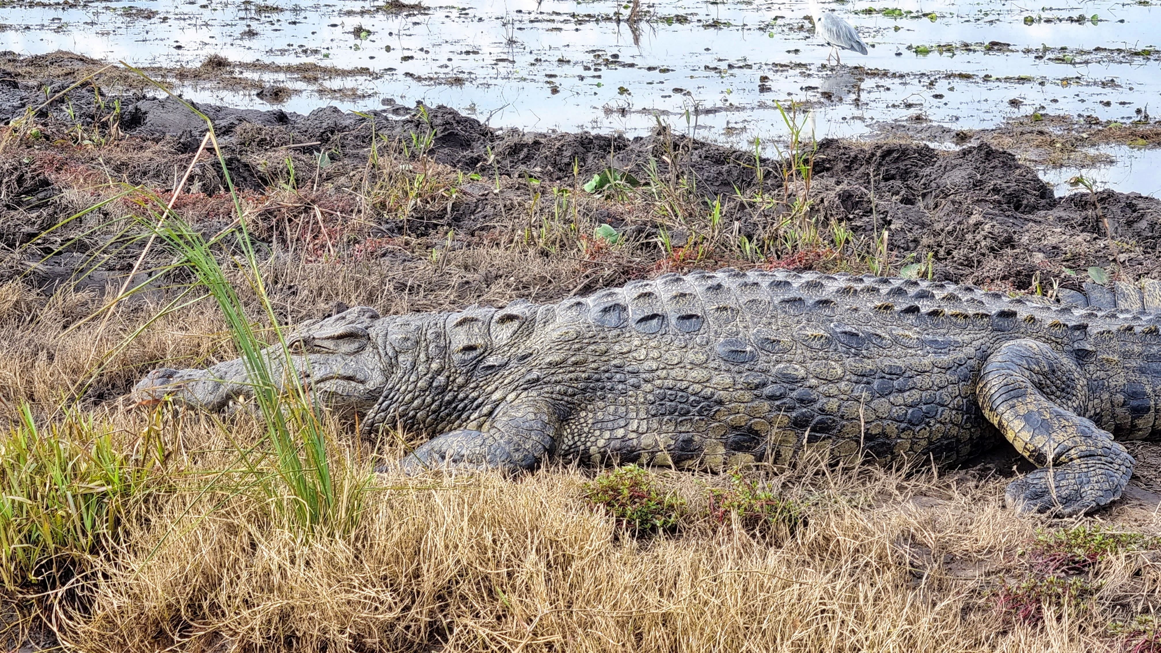 Sur la berge, on découvre des crocodiles cachés dans les herbes, à peine visibles, faisant la sieste. Le mâle reconnaissable à son ventre jaune et une femelle grise. Ces animaux vivent en solitaire et ne connaissent pas de prédateurs.