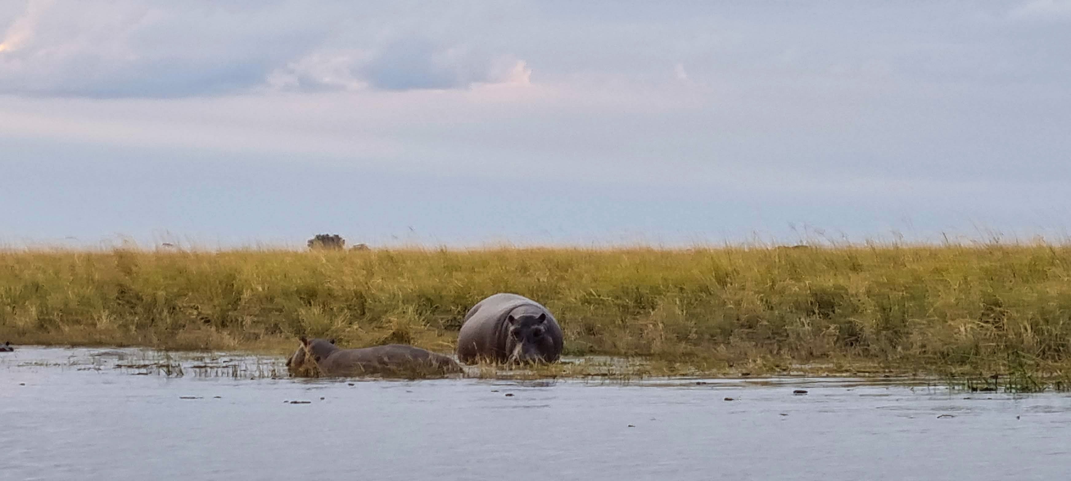 Et avant de faire demi-tour, des hippopotames, savourant des roseaux, immergés dans l’eau pour se protéger du soleil. Un groupe de girafes écartant les pattes pour boire se découpe dans le soleil couchant. Deux lions au loin achèvent ce tableau magnifique.