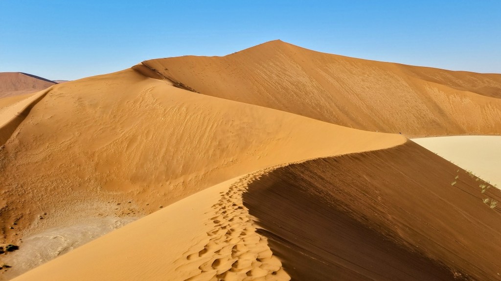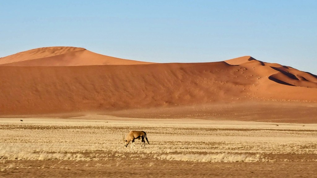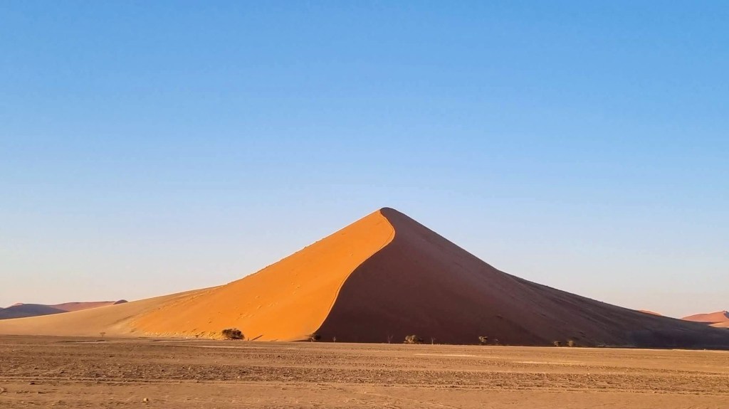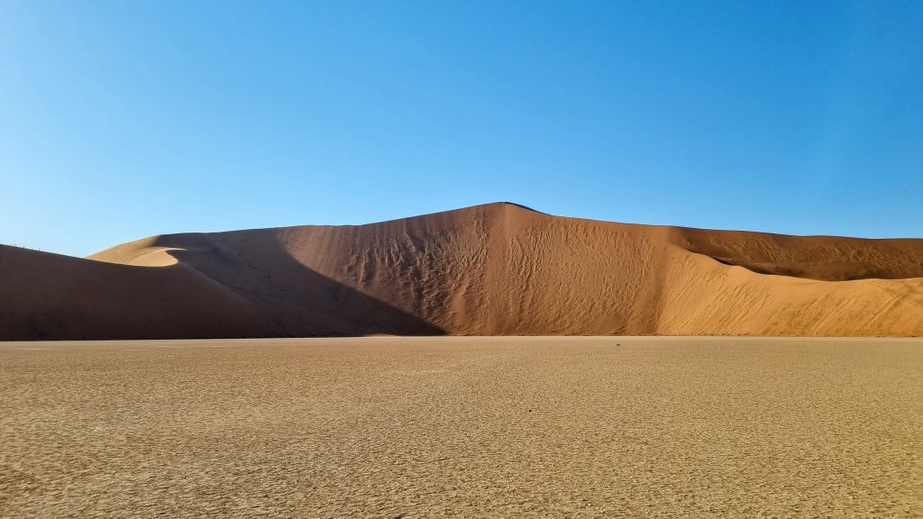 Le désert du Namib est le plus vieux au monde, de près de 80 millions d’années. Il longe l’océan Atlantique sur 1500 kilomètres pour une largeur de 80 à 160 kilomètres. Sossusvlei se trouve dans le parc de Namib-Naukluft. Les dunes s’élèvent à plus de 300 mètres au-dessus de la rivière asséchée Sesriem qui la traverse. La couleur rouge du sable est due à l’oxyde de fer.