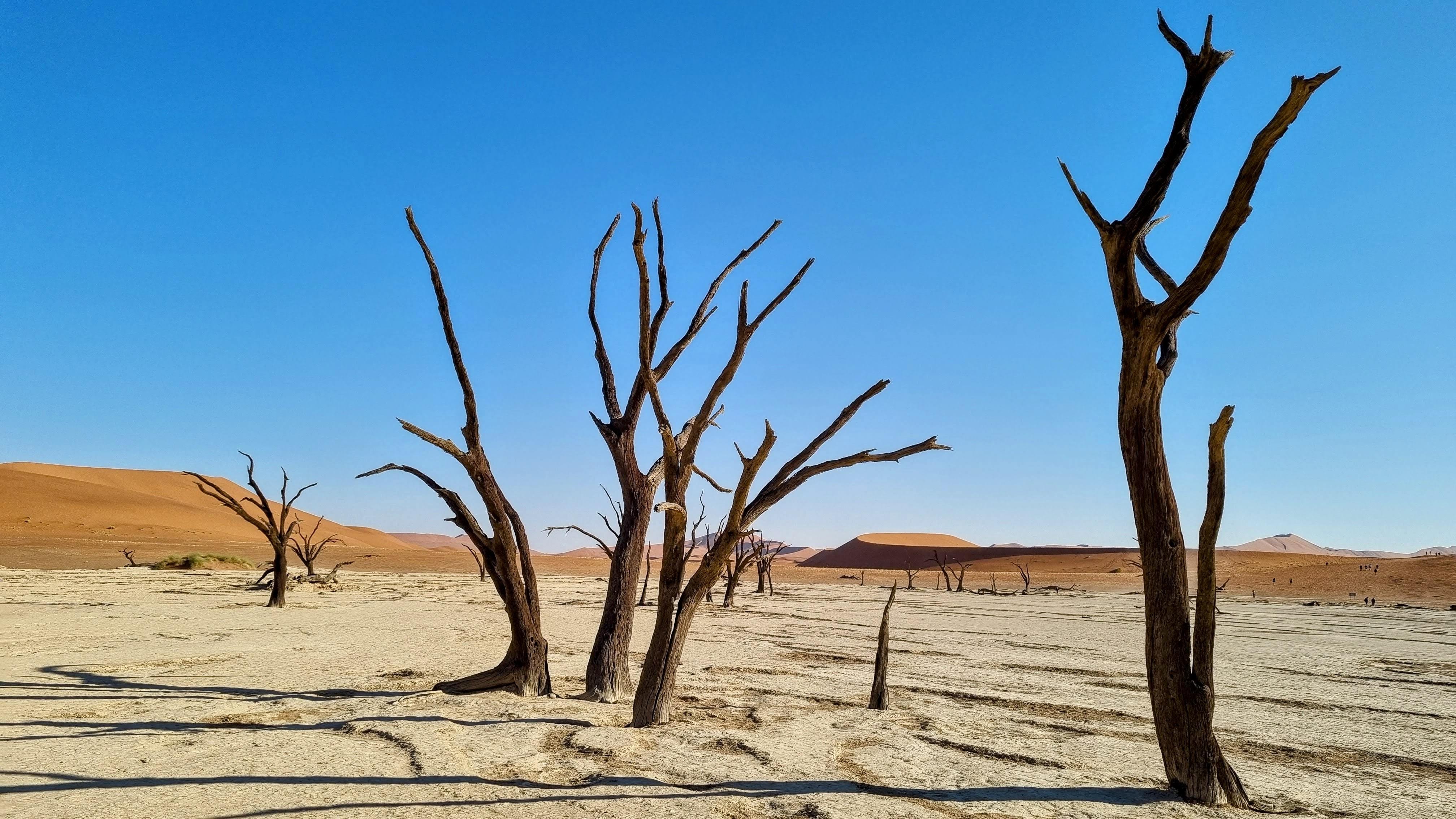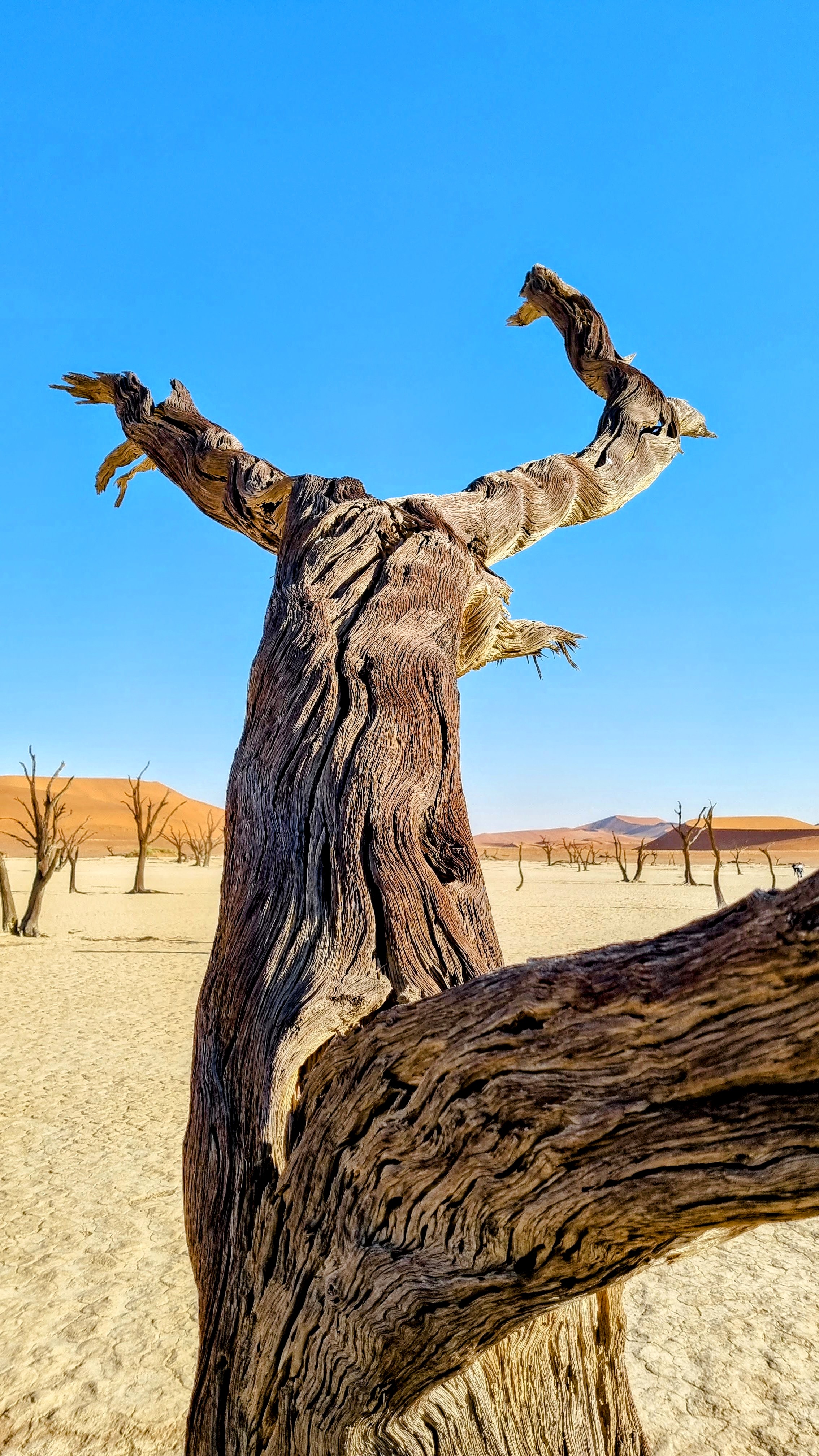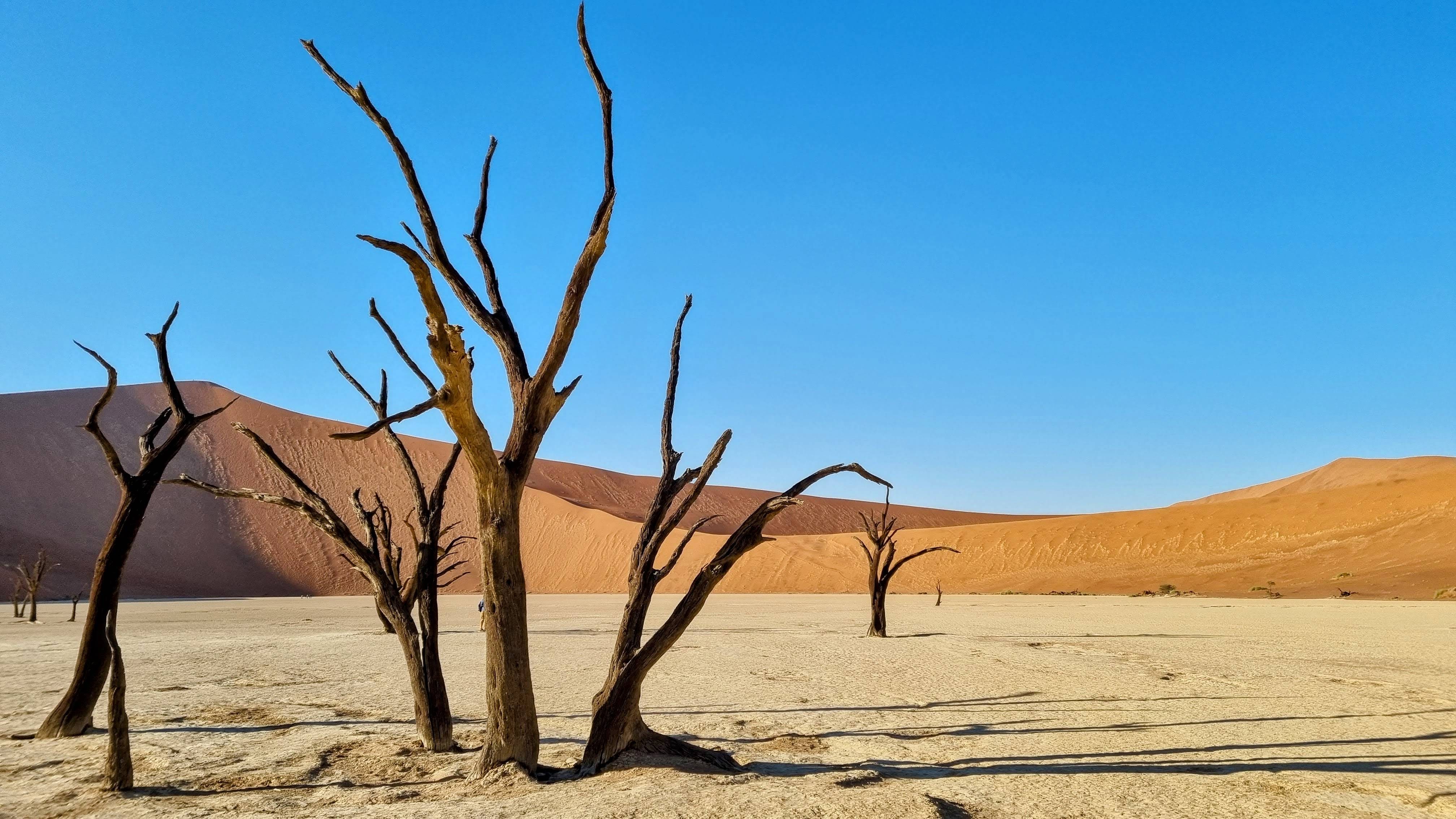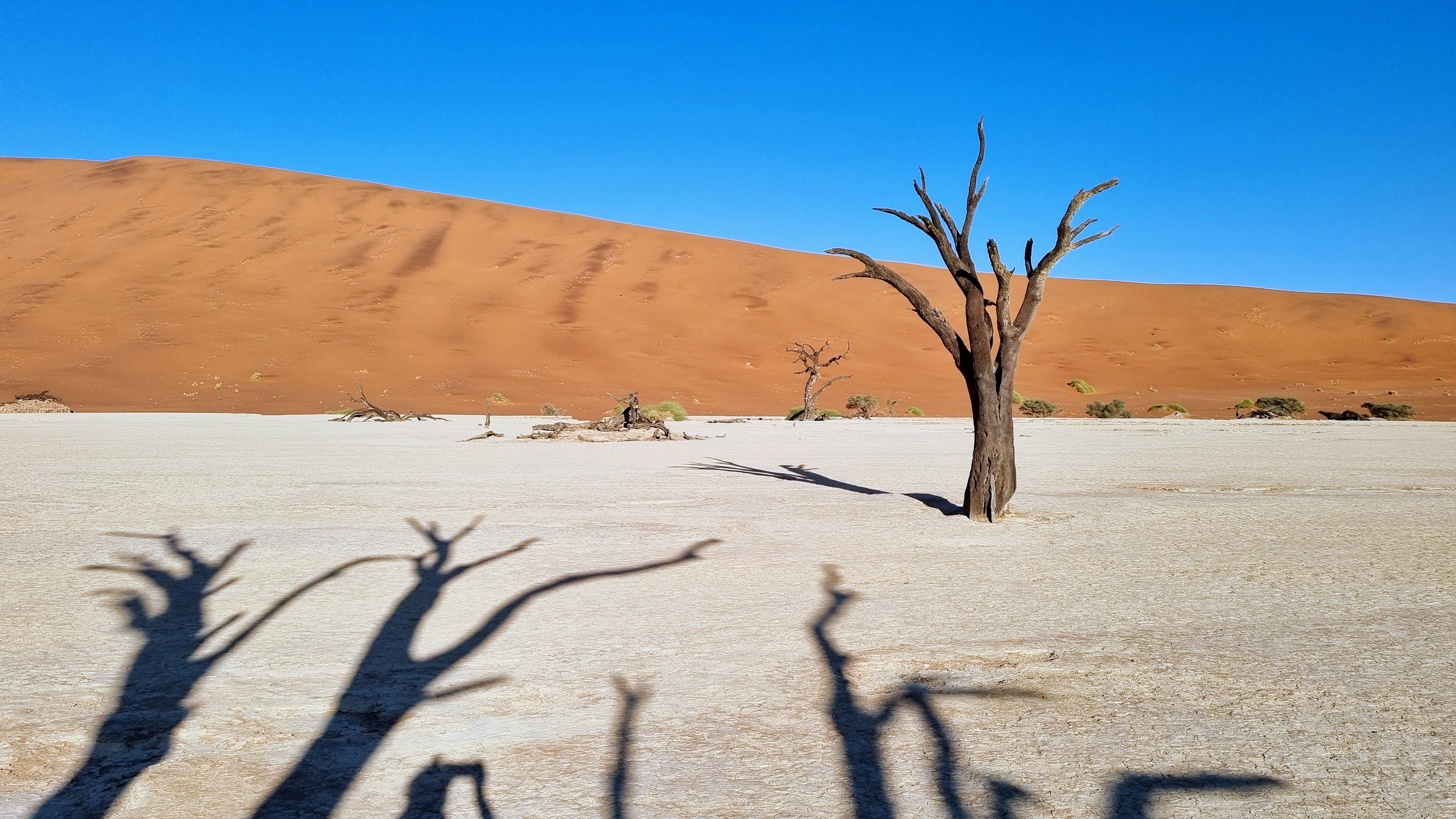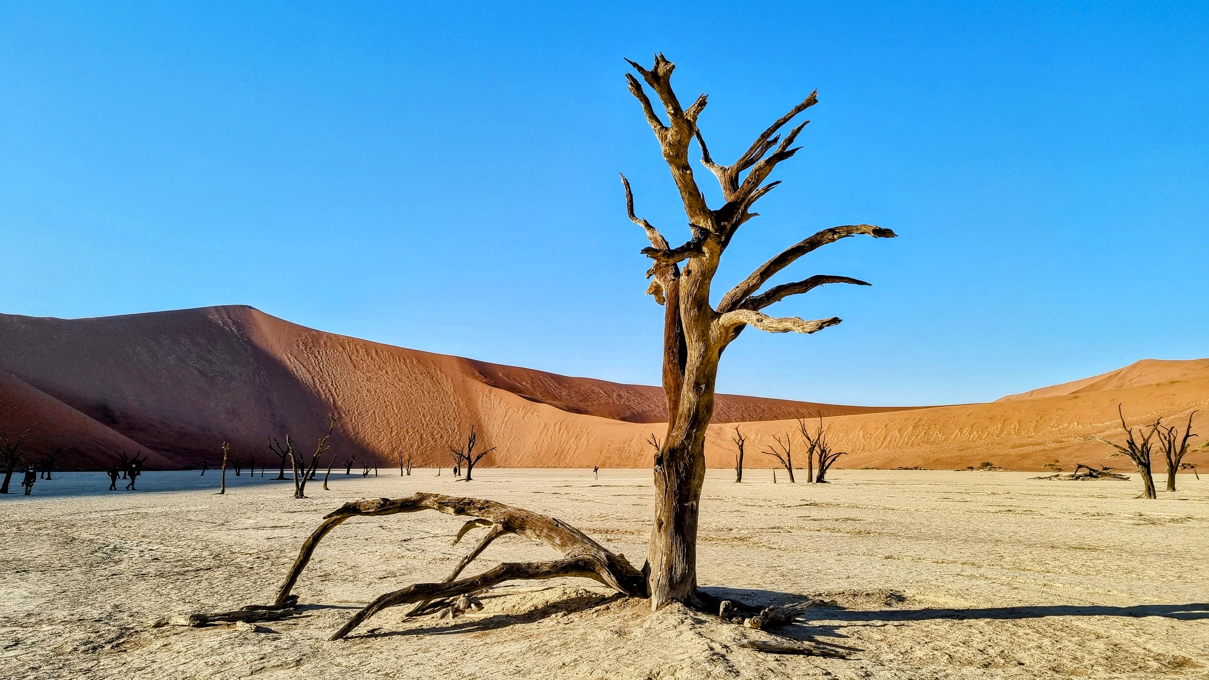 DUNE 45 Deadvlei, cuvette d’argile blanc en contraste avec les dunes rouges et ses arbres pétrifiés depuis 600 ans.